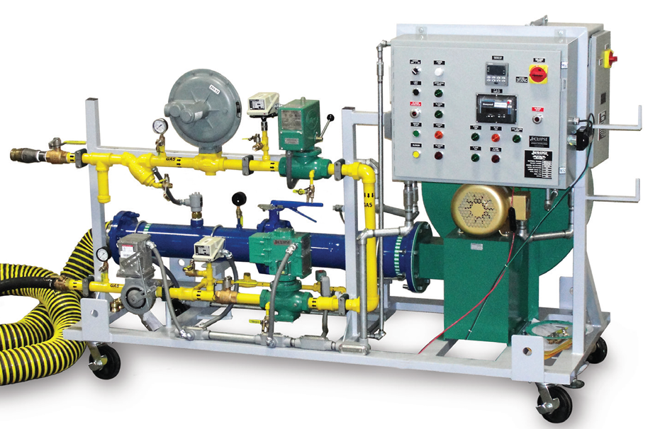 O carrinho principal de gás e ar inclui o trem de válvulas de gás, painel de controle e soprador de ar de combustão para fornecer um sistema completo em uma estrutura com rodas.